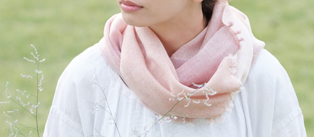 昨年、企画し販売しました「ボタニカルオーガニック ライトスヌード」。工房織座が着尺幅のレトロ織機で織りなす、一重のガーゼ、輪っかの形をしたスカーフ。