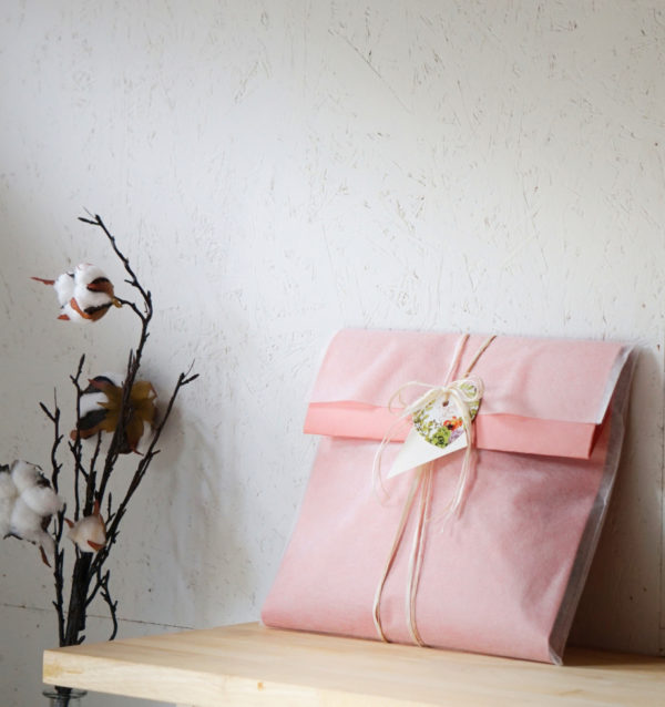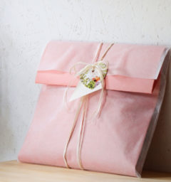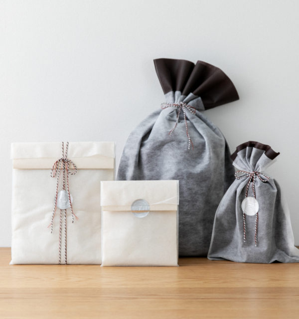 水布人舎のLETTER&TOWELS(ハンカチ)などお気軽なお品は、簡易包装+梨地の手提げバッグをお付けします。
