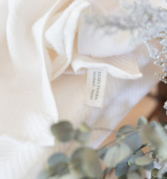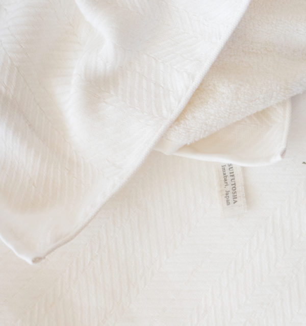 しっとりとなめらかな肌ざわりの杉綾織りガーゼ、ふんわりとやわらかな風合いの無撚糸パイル。