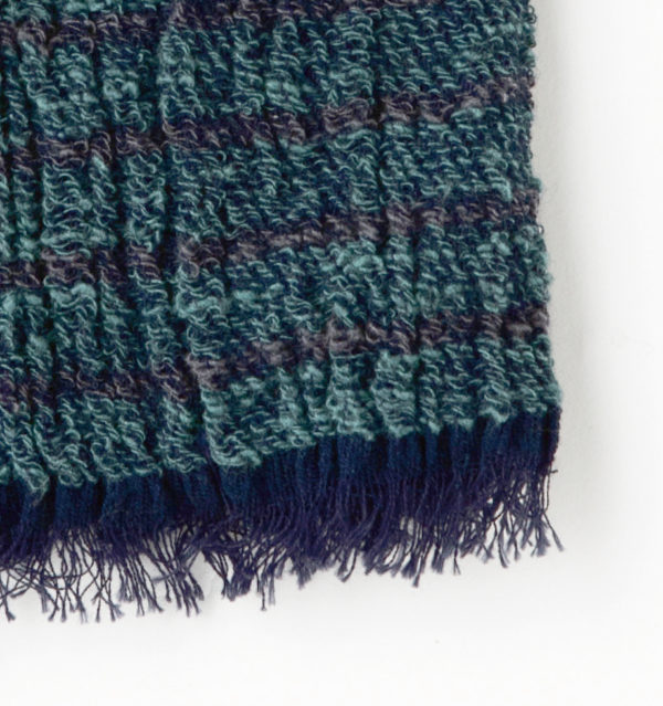 ボーダー柄や両端のフリンジが無作為に見え隠れして、自然に身にまとえます。