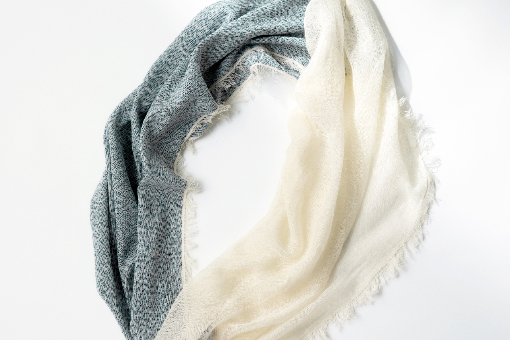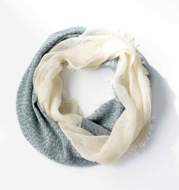 レース調の薄地とほどよく厚みのある生地の2種をつなげた新しいスヌード。