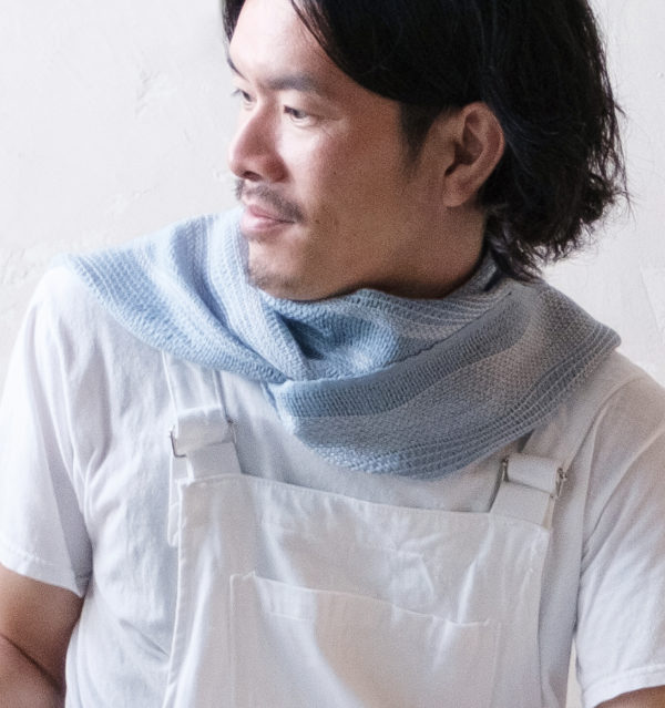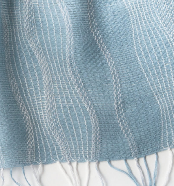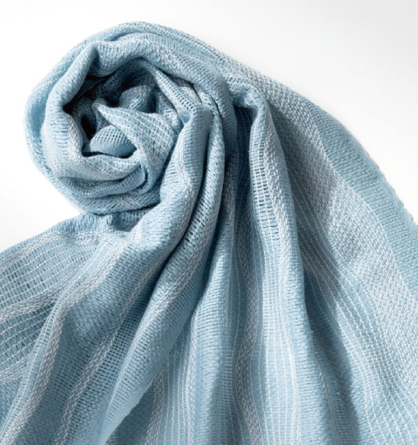 コットンライクな麻混素材の刺子ゆらぎ縞マフラー、ルックスとタッチともに涼やかさを感じる1枚。