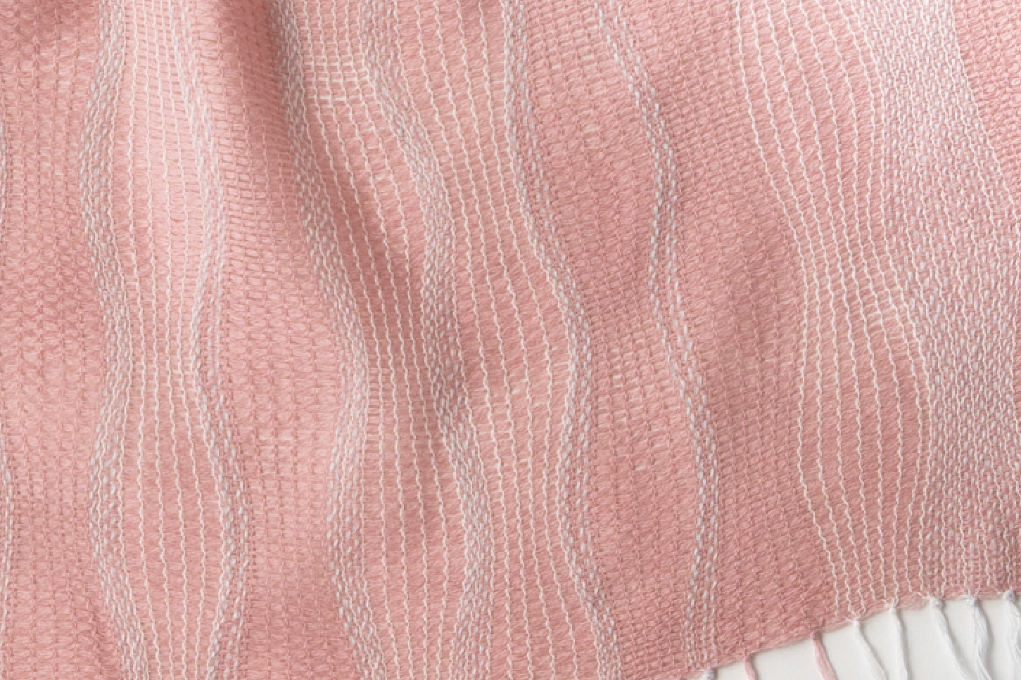たて糸とよこ糸がともにゆらぎ、まるで孔雀模様のように見える独創的な織り方です。よこ糸をたて糸が縛るような形になるので、目よれせず、美しい柄をくずすことはありません。工房織座でしかできない、世界でただひとつのオリジナルの織り方です。