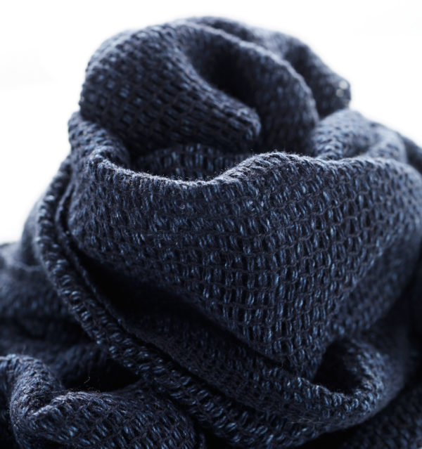 ジーンズに使われる中白の染め糸を使ったもじり織りのカジュアルなマフラー。
