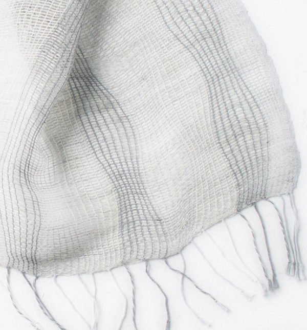 ゆらいだたて糸が波模様を描き出すデザイン性の高い織り方です。よこ糸をたて糸が縛るような形になるので、粗い目にかかわらず柄がくずれません。通気性がよく、軽やかでやわらかな風合いに仕上がるのが特徴です。