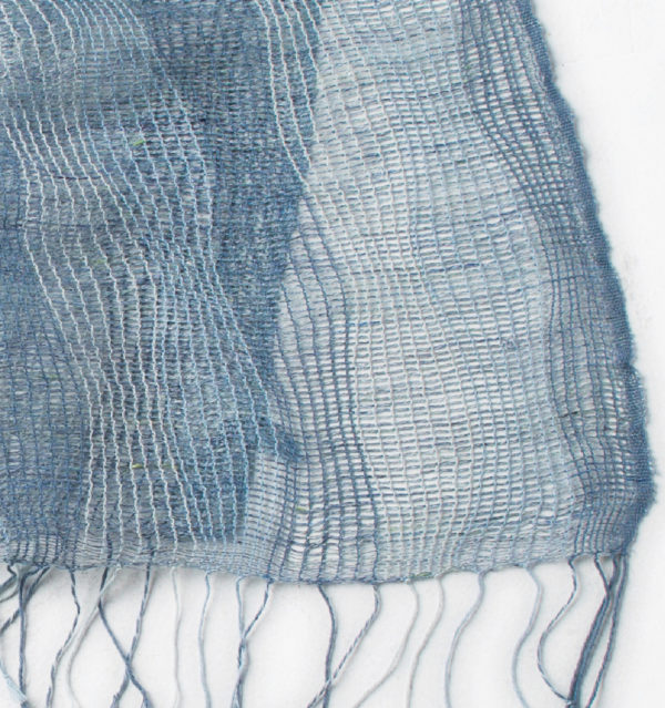 ゆらいだたて糸が波模様を描き出すデザイン性の高い織り方です。よこ糸をたて糸が縛るような形になるので、粗い目にかかわらず柄がくずれません。通気性がよく、軽やかでやわらかな風合いに仕上がるのが特徴です。