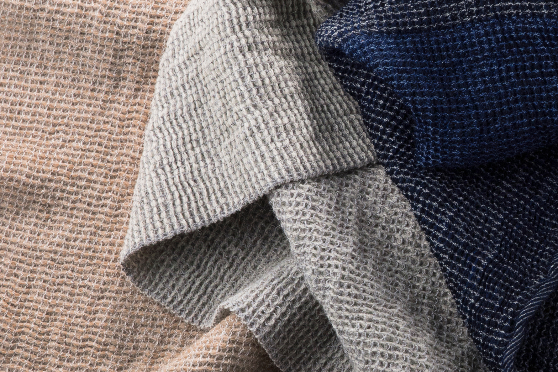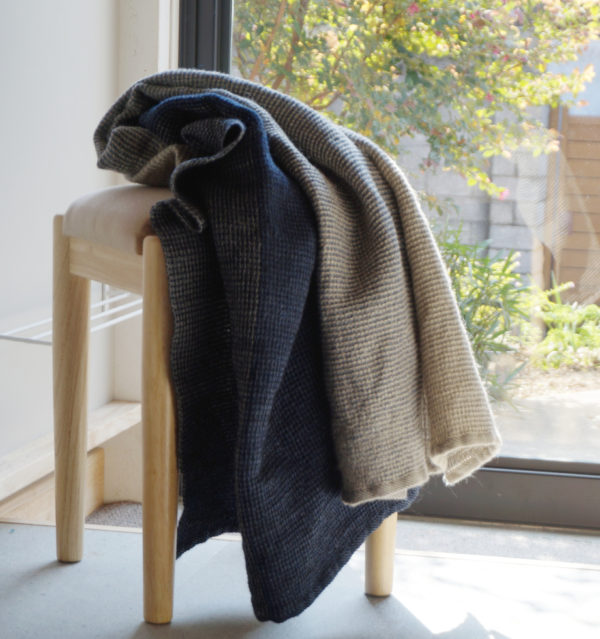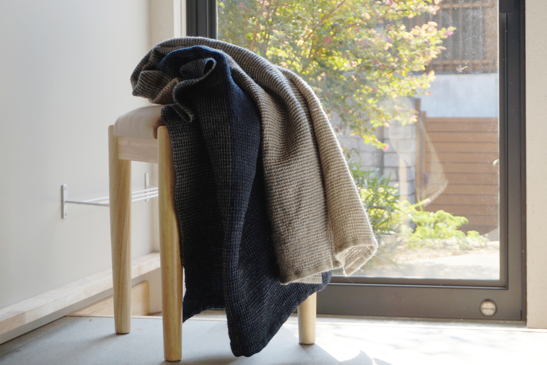 ひざかけに、ブランケットに現存の少ない今治製シャトル織機「村秀」。 昭和中期にタオルを織っていた織機を改造し、新たに織りなしたウールとメランジコットンのワッフルクロスです。