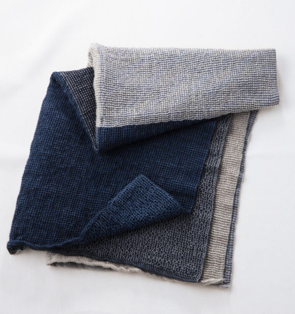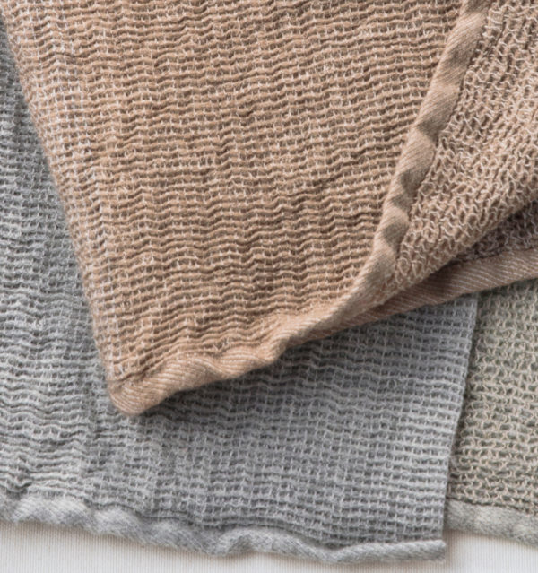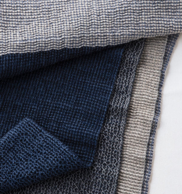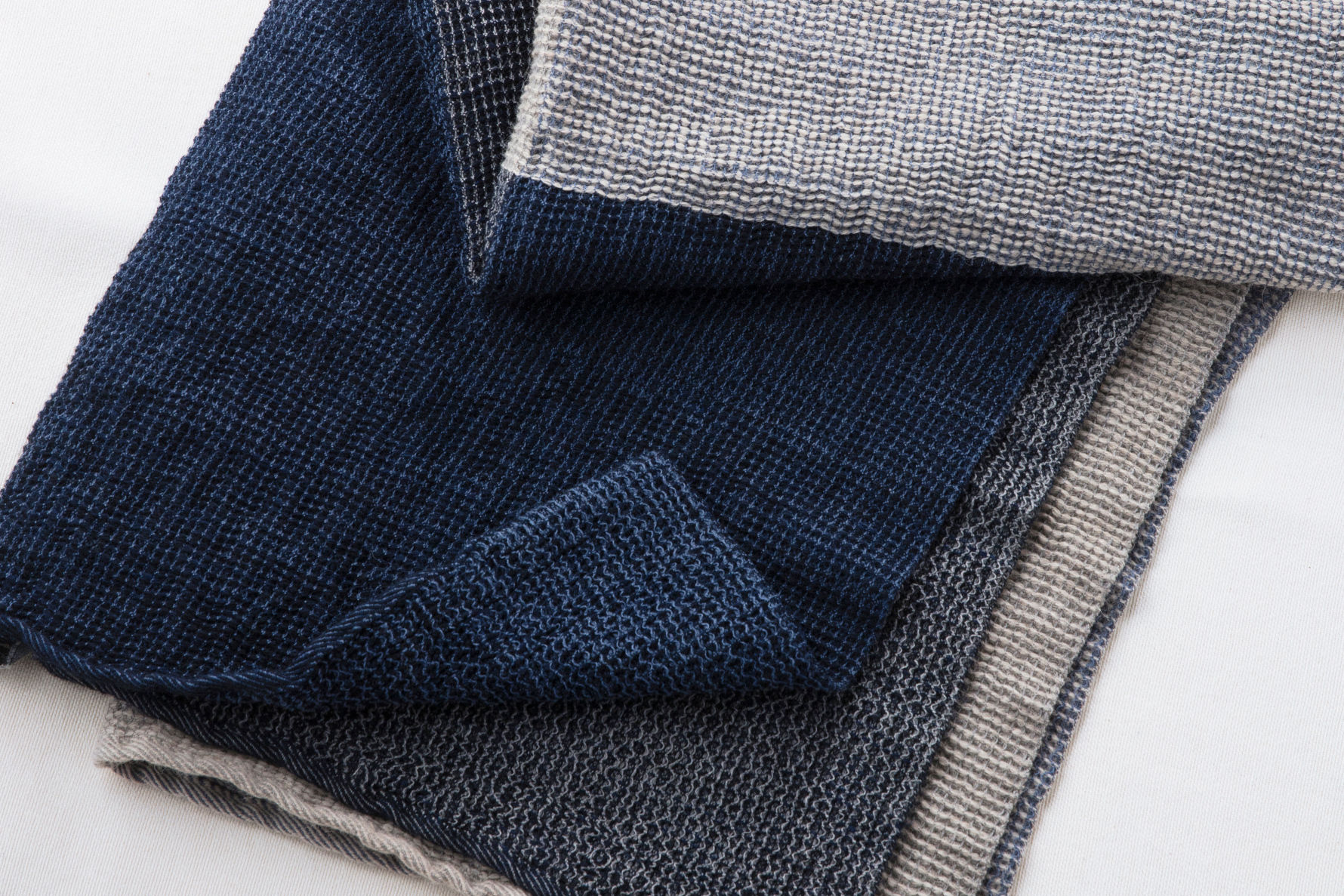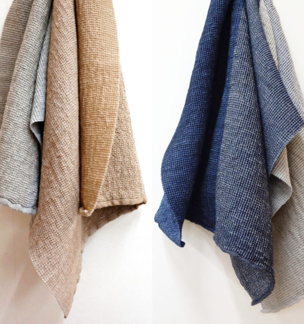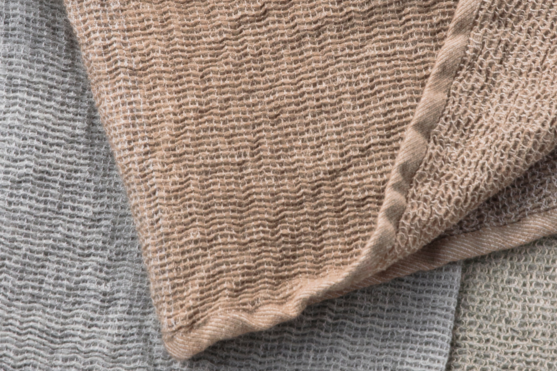 ひざかけに、ブランケットに現存の少ない今治製シャトル織機「村秀」。 昭和中期にタオルを織っていた織機を改造し、新たに織りなしたウールとメランジコットンのワッフルクロスです。