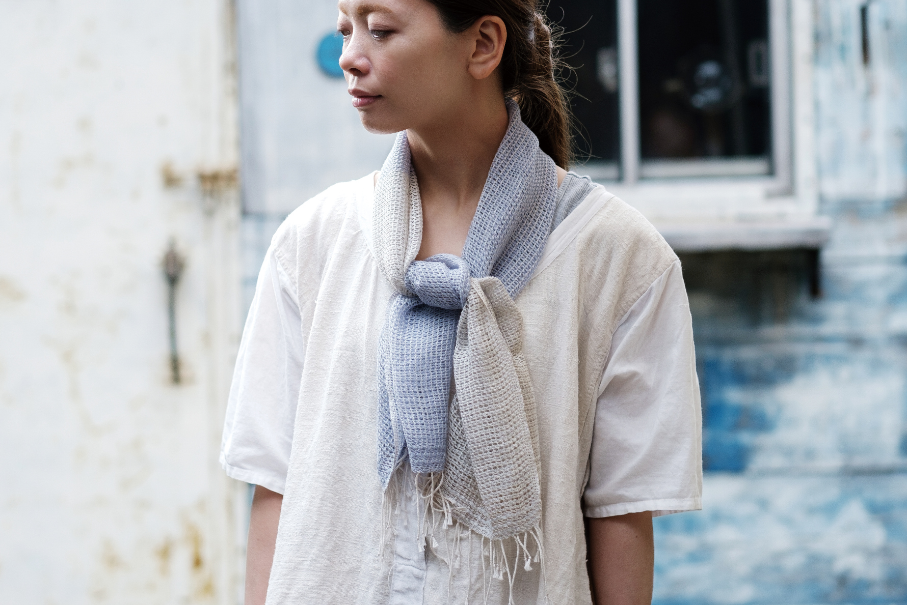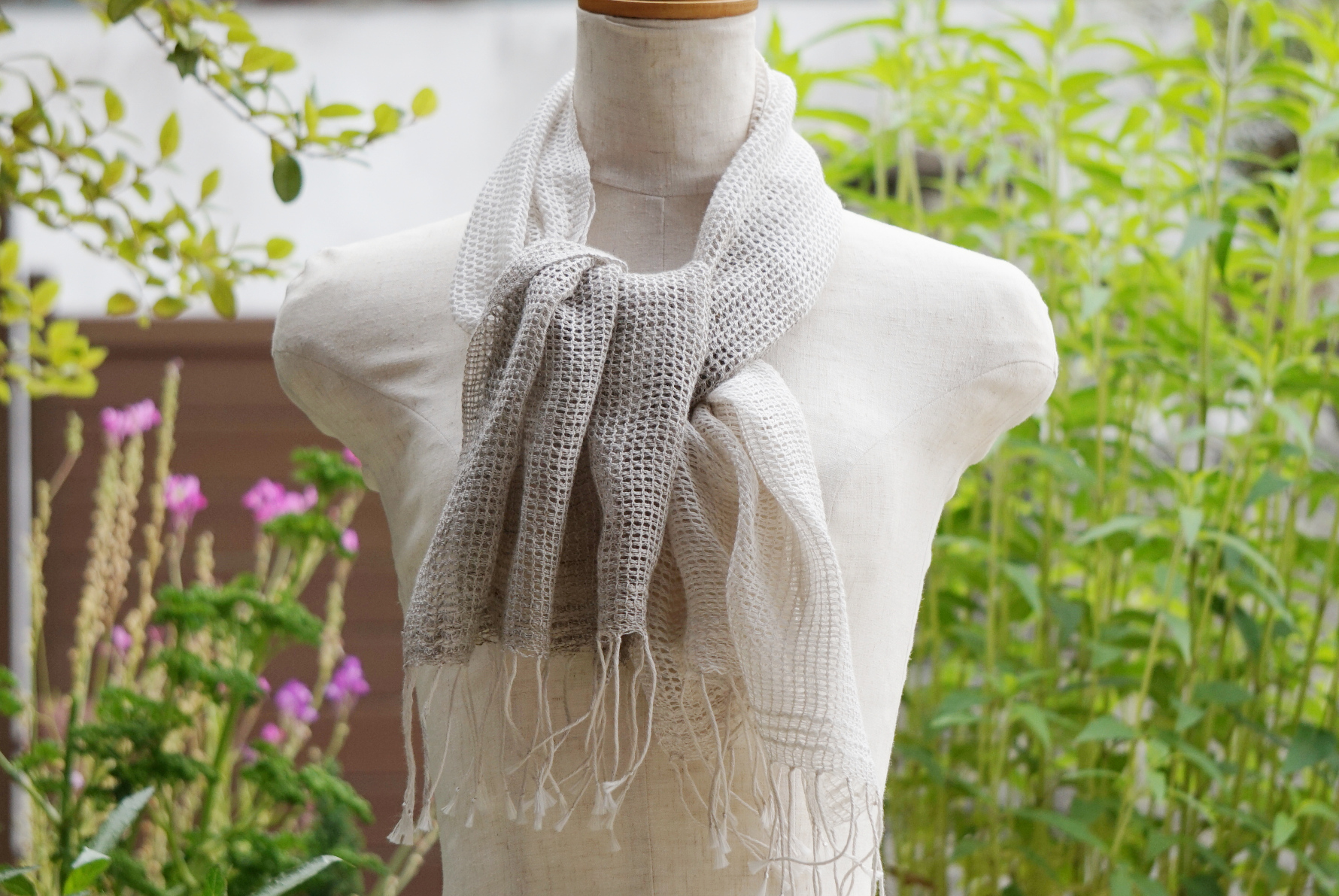 短いサイズですが、薄地なので「二重巻き」ができます。二重に巻いた時に、両端が少し垂れるサイズ感です。