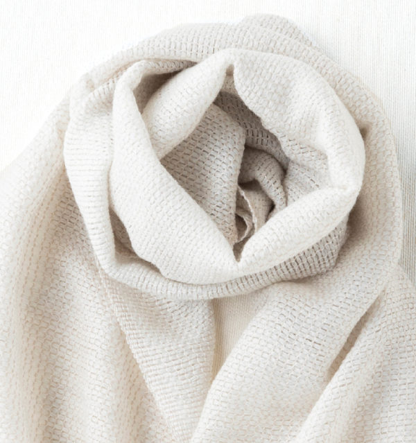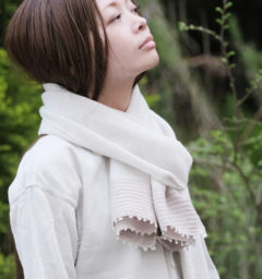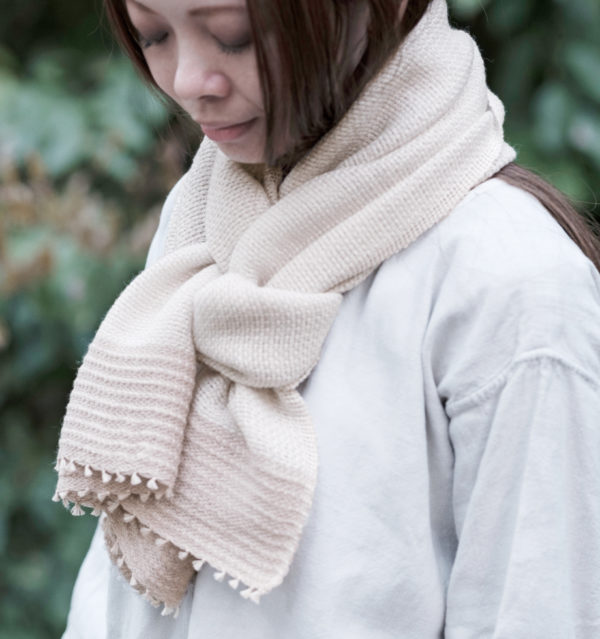 このマフラーを手に取り、まず実感するのが、ふんわりとしたやわらかい肌ざわり。