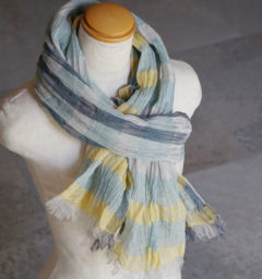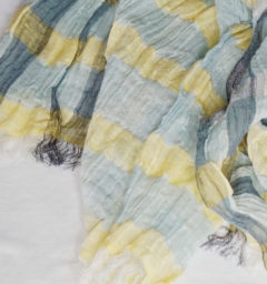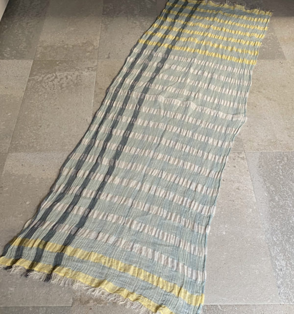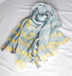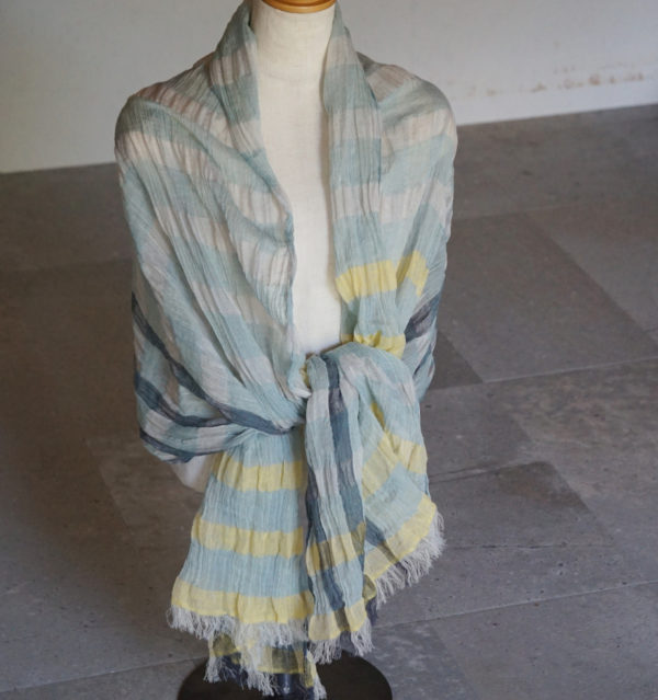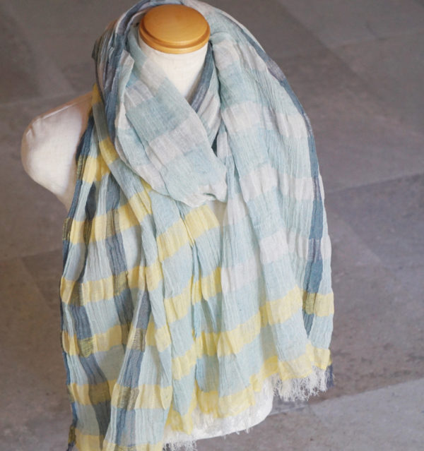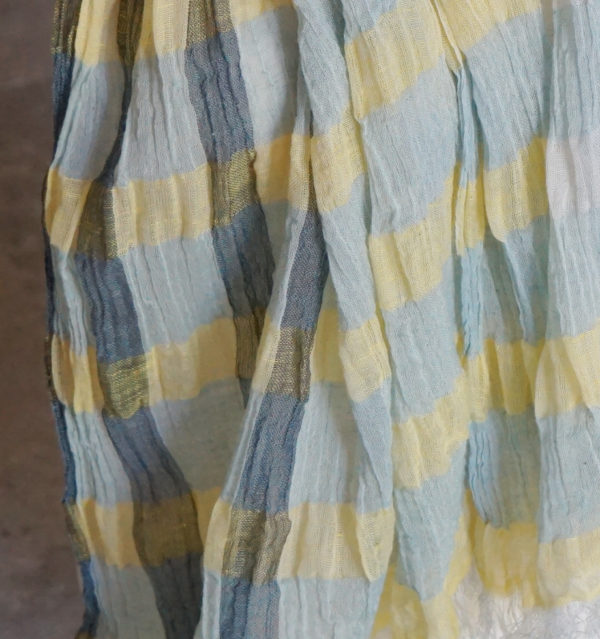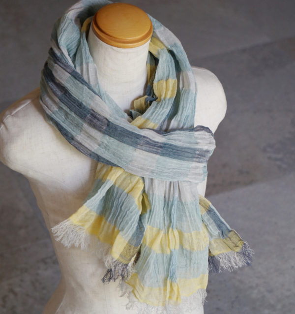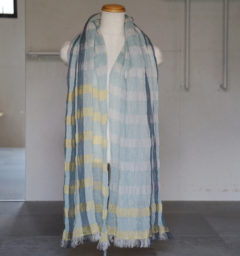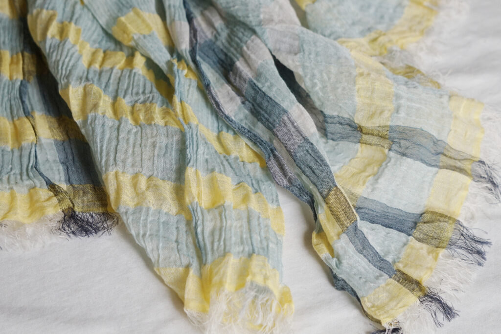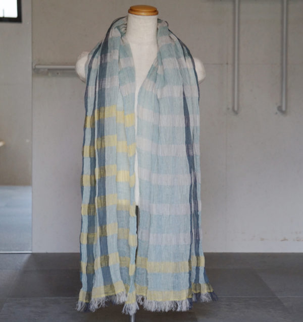 撚りを強くした綿麻糸と普通の撚りのリネン糸をよこいとに交互に入れてチェック柄にした、くしゅくしゅっとした大判ショール。