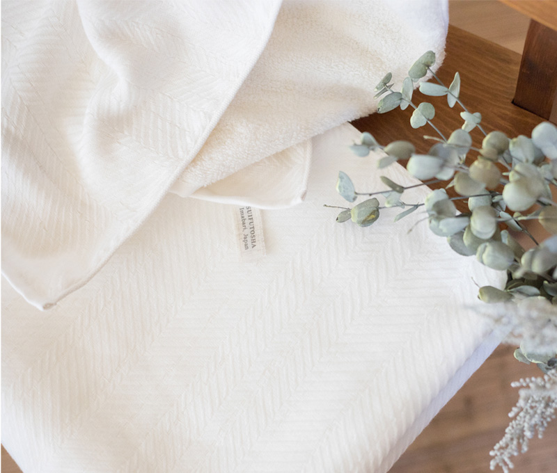 空気の通り道のある糸を使い、風通織りともいわれるほど風通しのよいパイル地とガーゼ地の二層で織りあげています。 しっとりとなめらかな肌ざわりの杉綾織りガーゼ、ふんわりとやわらかな風合いの無撚糸パイル。 瀬戸内の澄んだ空気をいっぱいつつみこんだ軽くて、ソフトなパイル&ガーゼのタオルです。