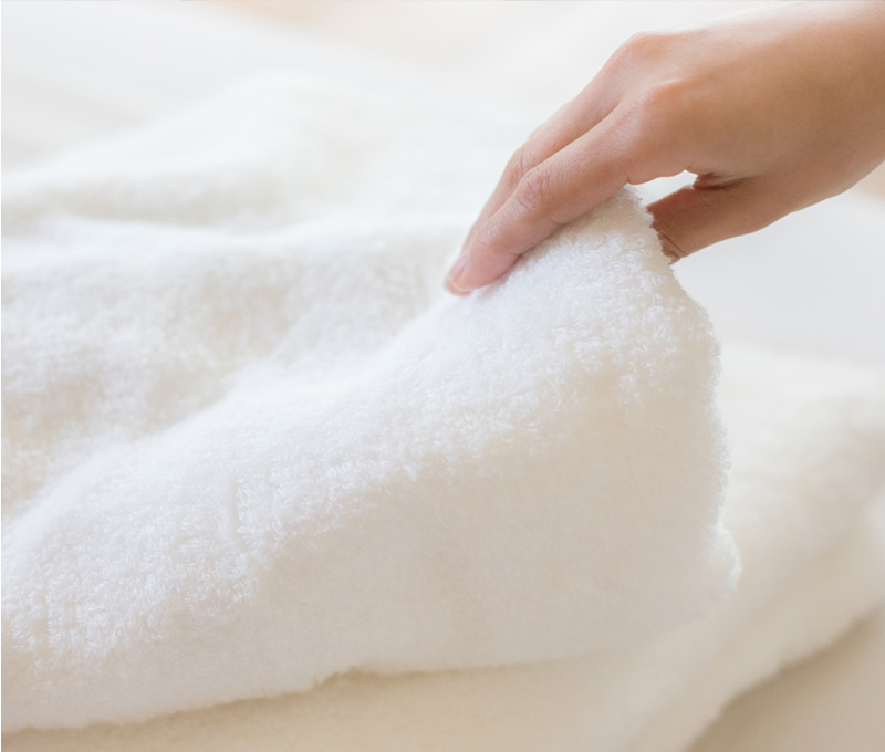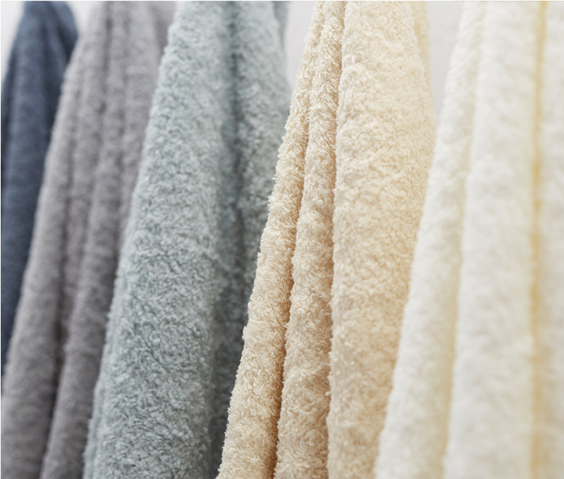 アメリカサンホーキン綿の中でも、成熟しきる前の早摘みわたを厳選して紡がれた糸。その無撚糸をロングパイルで織り上げています。 その繊細の糸質はしっとりとやわらかく、毛羽落ちも少ない。ふんわりとボリュームがありながらも、驚きの軽さを実現しています。そして、すっと吸水してくれる。そんな理想のタオルができました。